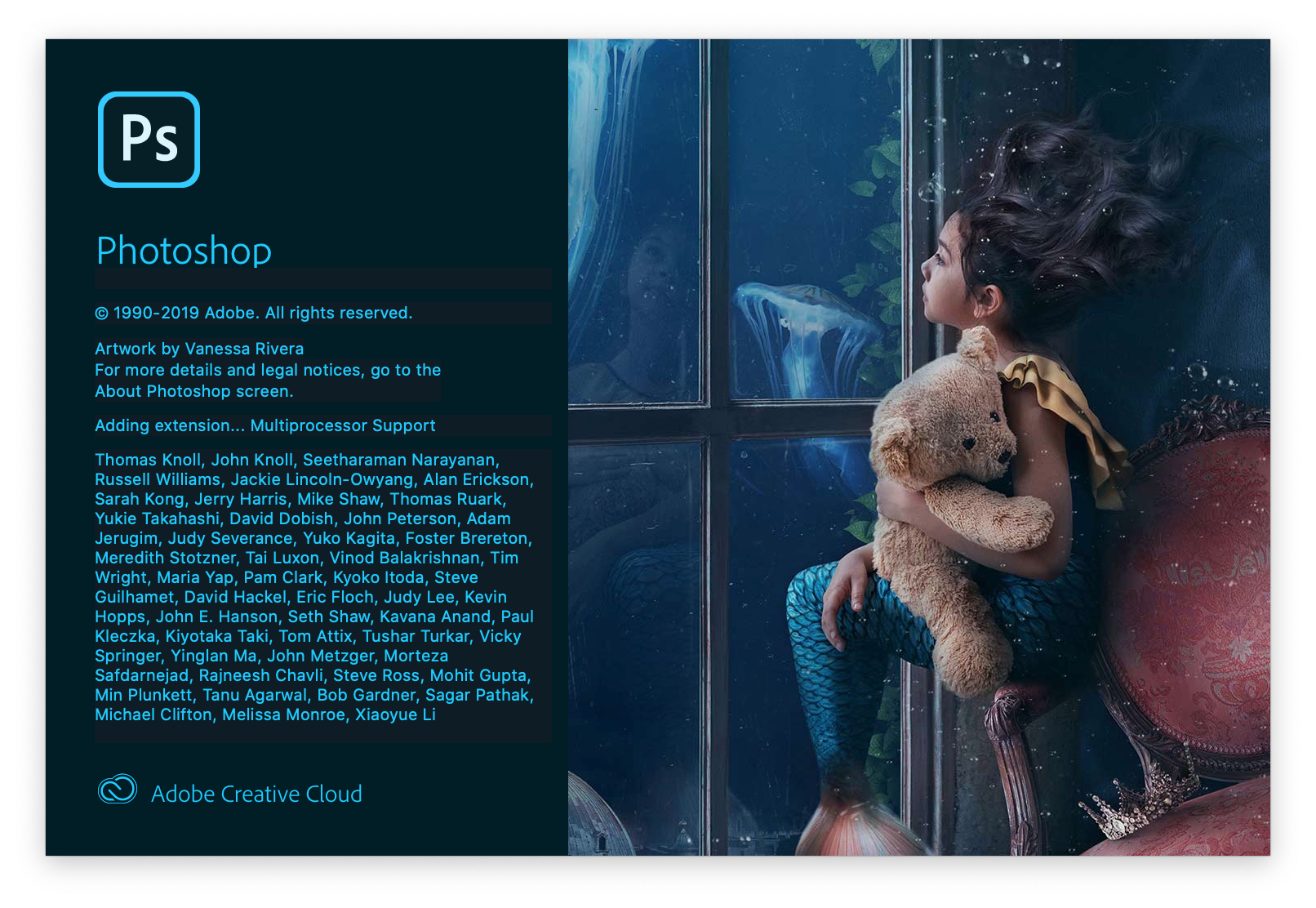 This Photoshop splash screen is beautifully atmospheric — the dreamy underwater scene with the child holding a teddy bear feels both magical and serene. The artwork instantly draws you in and sets a creative tone, making it a memorable and inspiring opening for the software.
