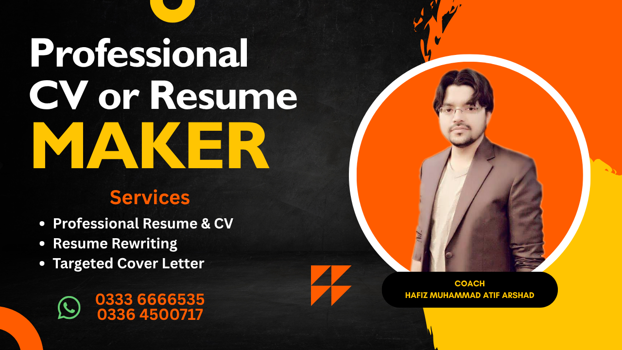 This promotional graphic effectively advertises professional CV and resume-making services using bold typography and a clean layout. The contrasting black, yellow, and orange colors give it a modern, eye-catching look. The photo on the right adds a personal touch, while the listed services and contact numbers are clearly displayed, making the design both attractive and informative.